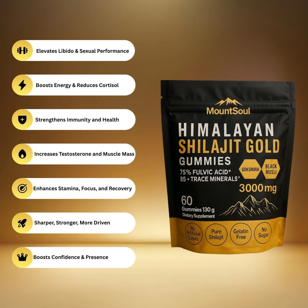 MountSoul® Himalayan Shilajit Gold Gummies deliver a clean, lab-tested blend of real Shilajit, Gokshura, Ashwagandha, and essential trace minerals — formulated to support daily male vitality, strength, and balanced performance.